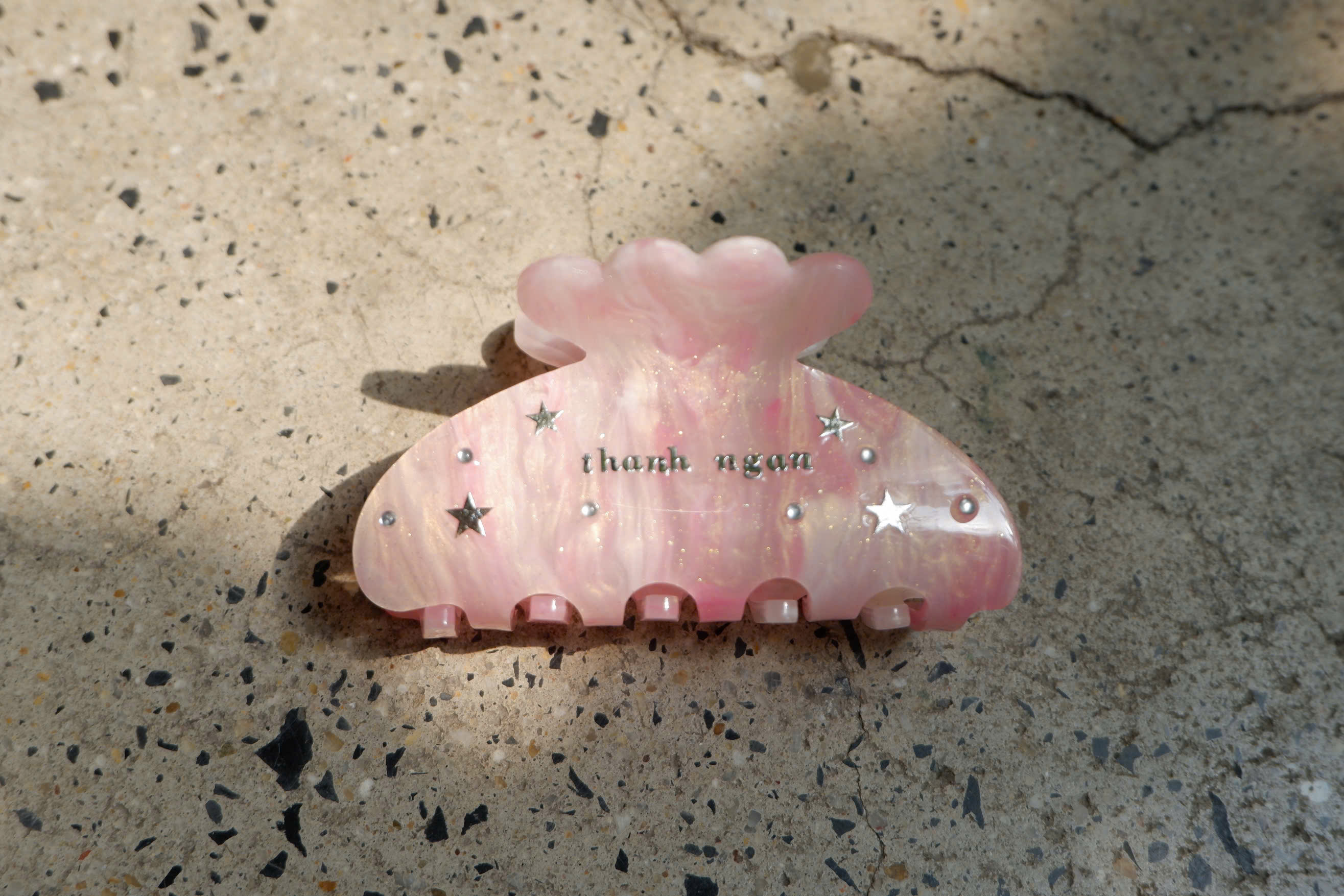Kẹp tóc Rose Quartz trong bộ sưu tập Starry Babe — tone hồng ngọt ngào, điểm xuyết ngôi sao ánh bạc.